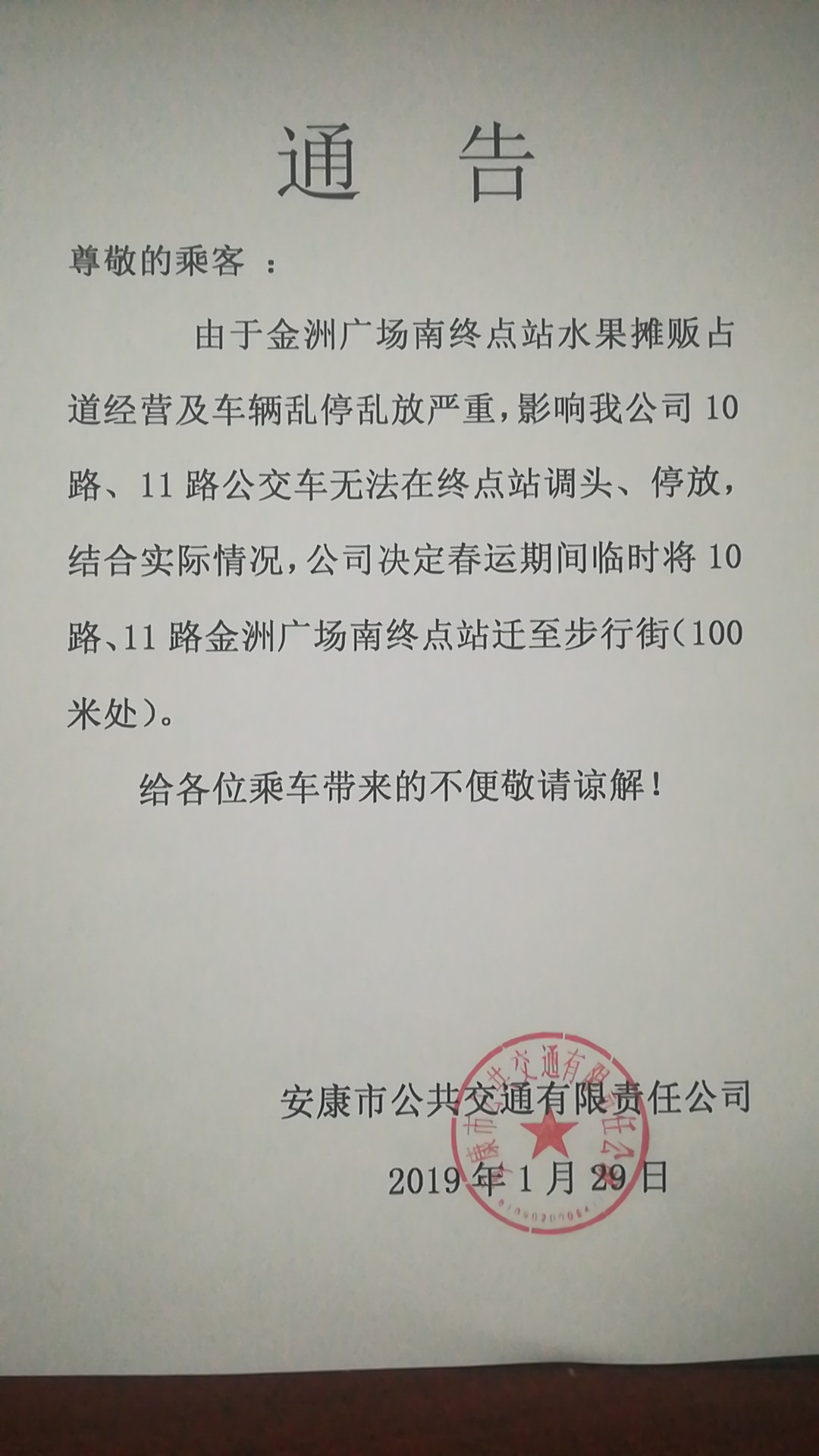 由于金洲廣場(chǎng)南終點(diǎn)站水果攤販占道經(jīng)營(yíng)及車(chē)輛亂停亂放嚴(yán)重,影響我公司10路、11路公交車(chē)無(wú)法在終點(diǎn)站調(diào)頭、停放,結(jié)合實(shí)際情況,公司決定春運(yùn)期間臨時(shí)將10路、11路金洲廣場(chǎng)南終點(diǎn)站遷至步行街(100米處)。